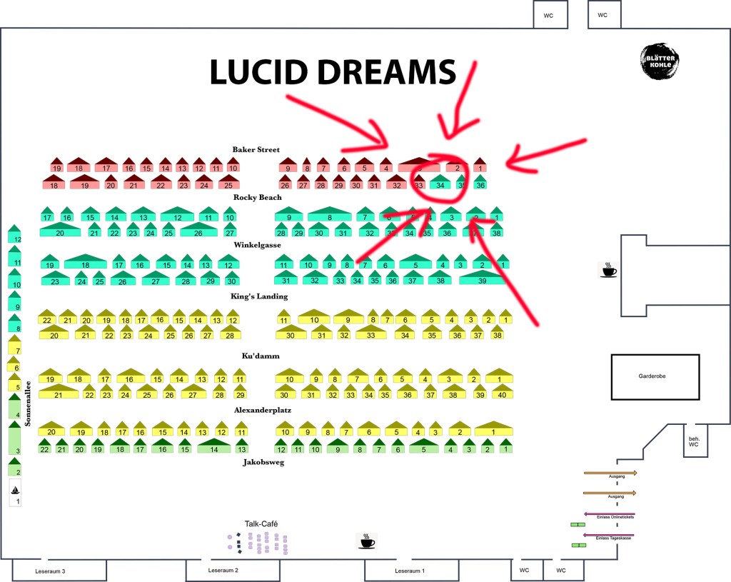 Letztes Jahr habe ich ausgesetzt, dieses Jahr bin ich wieder mit einem Stand auf BUCH-Berlin. In wenigen Tagen, am 27. / 28.09.2025 treffen sich die Buchnerds in Berlin. Ich freue mich sehr, wenn Du LUCID DREAMS besuchst. In den Jahren, in denen ich einen Stand in der Arena Berlin in Alt-Treptow gebucht hatte, 2022 und 2023, wurde ich vom Organisationsteam immer etwas verschämt am Rand des Geschehens »versteckt«. Diesmal ganz anders. Ich traute meinen Augen kaum und hab sicherheitshalber nachgefragt, aber auch auf dem definitiven Standplan, der uns diese Woche zugeschickt wurde, hat sich nichts geändert: Du findest LUCID DREAMS im Zentrum, genau in der Hallenmitte. Stand i2. Ich schreibe sicherheitshalber i2, weil I2 wie 12 aussieht. Und wo ist bitte Stand Nr. 12? Hallo! Es gibt keinen Stand Nr. 12. 😀 Also: i2 direkt neben der Lounge.