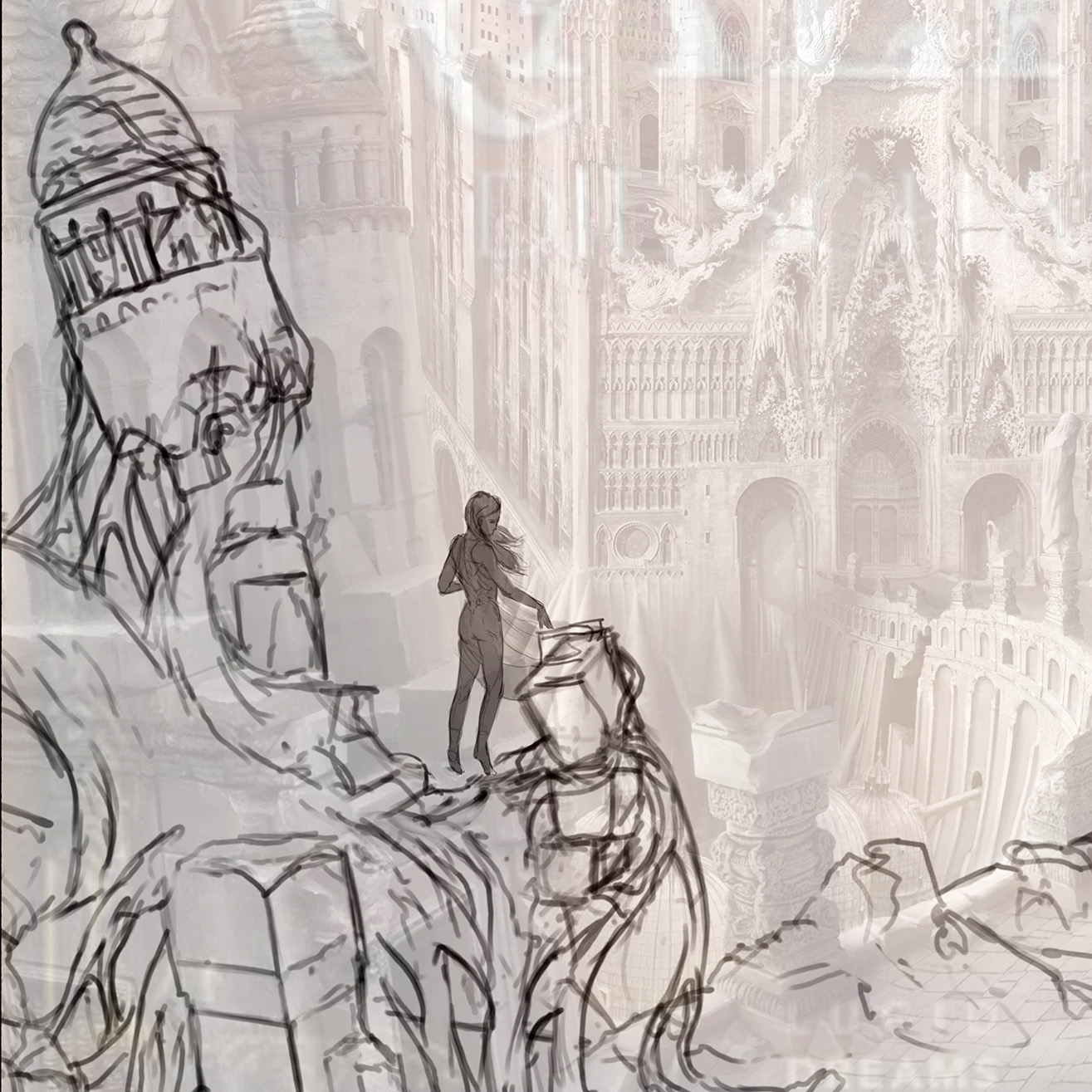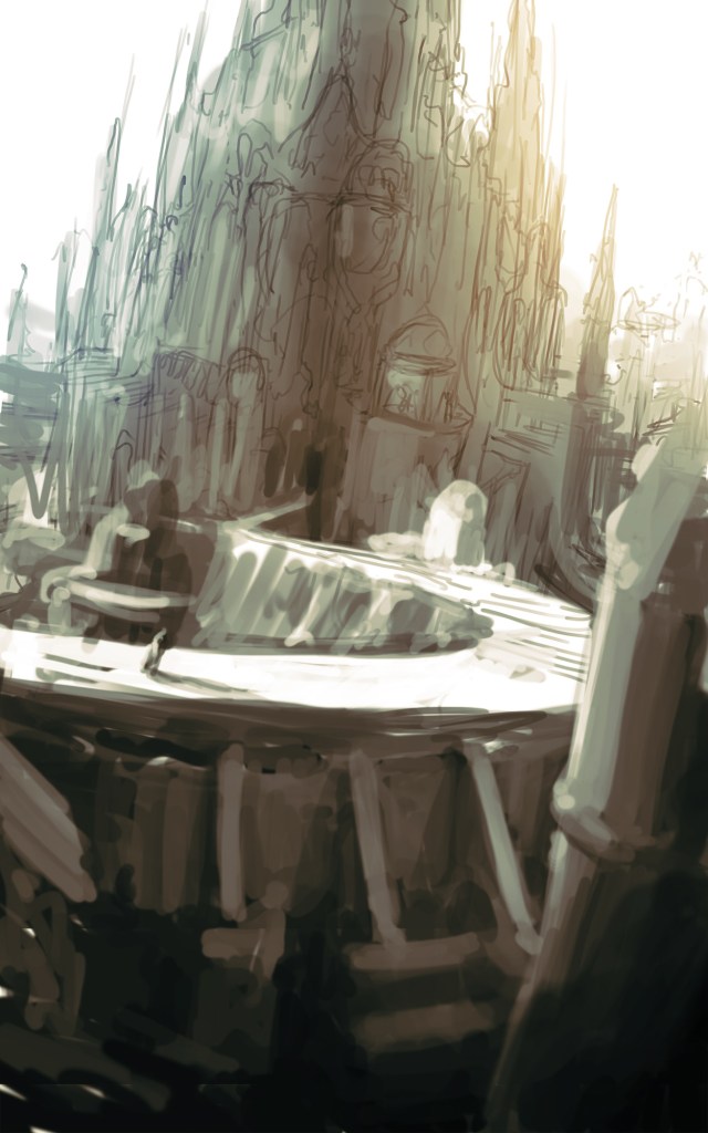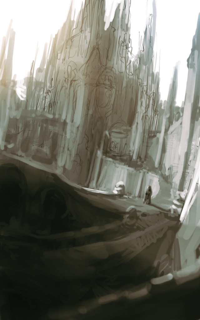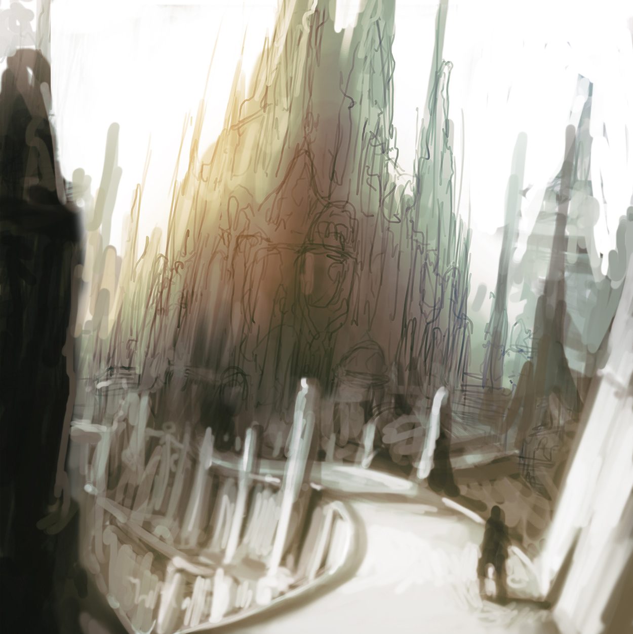 Das Konzept gefiel uns und wir beschlossen in diese Richtung zu gehen. Verworfen haben wir die weiße Farbgebung. Ich hatte das Gefühl, dass sie ein anderes Genre erzählt. Fantasy oder High-Fantasy. Die Dunkelheit der Endzeit fehlte.
