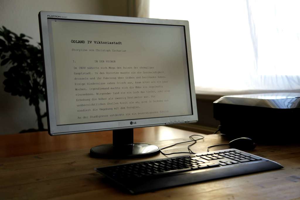 - C) Band IV aufteilen, z.B. in Teil 1 + 2. Die Lösung bringt den Nachteil, dass ich immer angekündigt habe, ÖDLAND wäre eine Reihe in vier Bänden. Das riecht nach Neverending Story. Außerdem fand ich die Aufteilung des letzten Bandes für die Kinoadaption von ‘Harry Potter‘ nicht gelungen. Mein Gedanke: Besser streichen als strecken. Besser eine dichte, intensive Atmosphäre, als Leerlauf. Auf der anderen Seite lebt ÖDLAND gerade von den ruhigen Momenten, von Einsamkeit und Stille. Momente, in denen wir nur „den Staub und die Gedanken der Protagonisten“ schlucken, wie es In Flagranti Books wunderbar auf den Punkt gebracht hat. Diese Momente könnten natürlich zu kurz kommen, wenn man sich zu sehr auf die Story konzentriert.